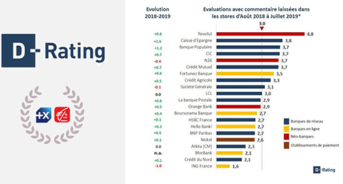 Banque Populaire et Caisse d’Epargne, premières des banques traditionnelles sur le niveau d’usages et de performance des canaux digitaux des banques de détail (voir ci-dessous). C’est le résultat du dernier classement de l’agence de notation digitale D-Rating, publié le 22 octobre. Il s’agit de la plus forte progression du secteur entre 2018 et 2019, avec un gain de 9 places pour Banque Populaire et 6 places pour Caisse d’Epargne, ce qui est considérable !